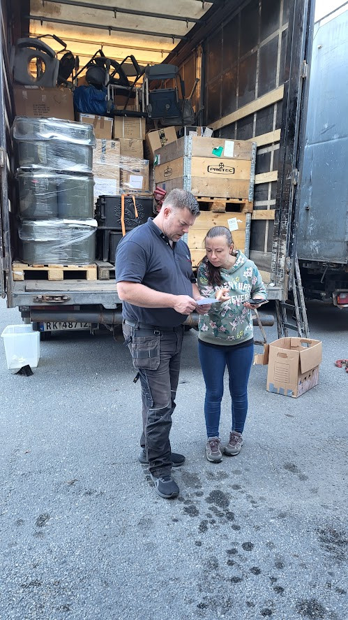 Flere hjelpere på dugnaden er selv flyktninger fra Ukraina i Noresund-området. De stod ekstra på med innsats og glød. Mye av lageret ble tømt på fire dager. Lageret gikk fra fullt til «tomt» etter alt var lastet opp.