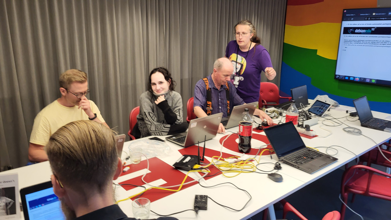 Over 20 hjelpere har bidratt med å installere Skolelinux på de bærbare i løpet av flere dugnader på Teknologihuset i Oslo i sommer. Over 30 personer har hjulpet til med pakking og lasting av nødhjelpen til Ukraina. Skolene har også fått pulter, stoler og skap fra Færder kommune.