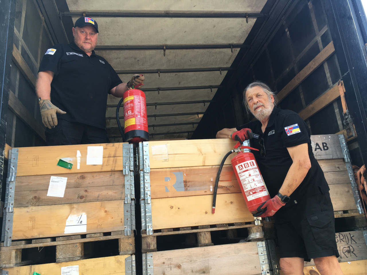 I Kharkiv leverte NorseAid 1200 brannslukningsapparater som er utgått på dato, men som likevel er fullt brukbare. Behovet var så akutt at folk kom med biler og hentet dem rett fra vogntoget vårt før vi rakk å sette dem på et lager. Samme kveld fikk vi bilder og videoer som viste hvordan disse apparatene slukket branner allerede. Vi fikk også se hvordan brukte brannslukningsapparater kan bygges om enten til varmeovner eller kokeapparater. Da vil disse apparatene hjelpe ukrainerne med å holde varmen og lage mat gjennom vinteren. På denne måten blir utdaterte apparater både brukt og gjenbrukt i Ukraina. Bildet under viser Erik Helgesplass og Ole Helgerud fra NorseAid som losser brannslukningsapparater.