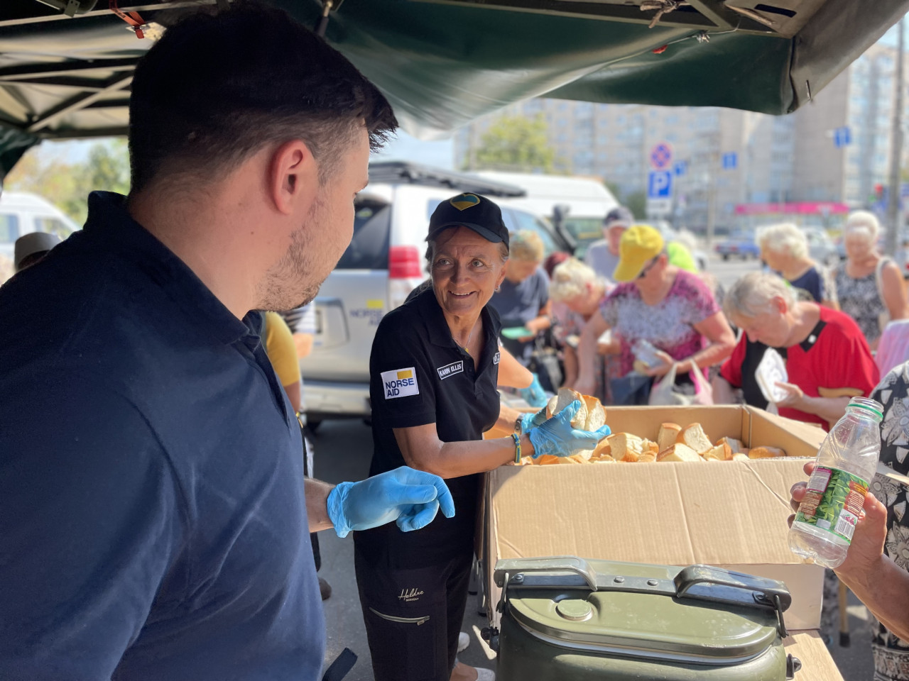 Ved Pokrovsk nær frontlinjen leverte NorseAid et feltkjøkken til Caritas Ukraina som skal stå for driften av kjøkkenet ved et transittmottak for internt fordrevne flyktninger. Kjøkkenet ble tatt i bruk samme dag som det ble levert og sørger nå for mat til mennesker i en svært sårbar situasjon. Hver dag kommer det nye internt fordrevne flyktninger til dette mottaket, og kjøkkenet til NorseAid sørger for ca. 600 varme måltider pr. dag. Bildet under viser kveldsservering fra dette feltkjøkkenet nær frontlinjen.